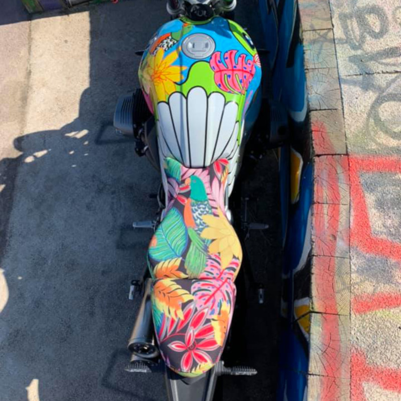 L'inspiration initiale de l'Art Bike 9T provient de la selle, réalisée avec un tissu déperlant qui provient d’une marque de mobilier d’extérieur Italien de luxe. La réalisation des motifs sur la selle est en parfaite osmose avec le travail d'artiste de Christophe, puisqu'il laisse s'exprimer son talent avec des tissus colorés sur lesquels il peint.