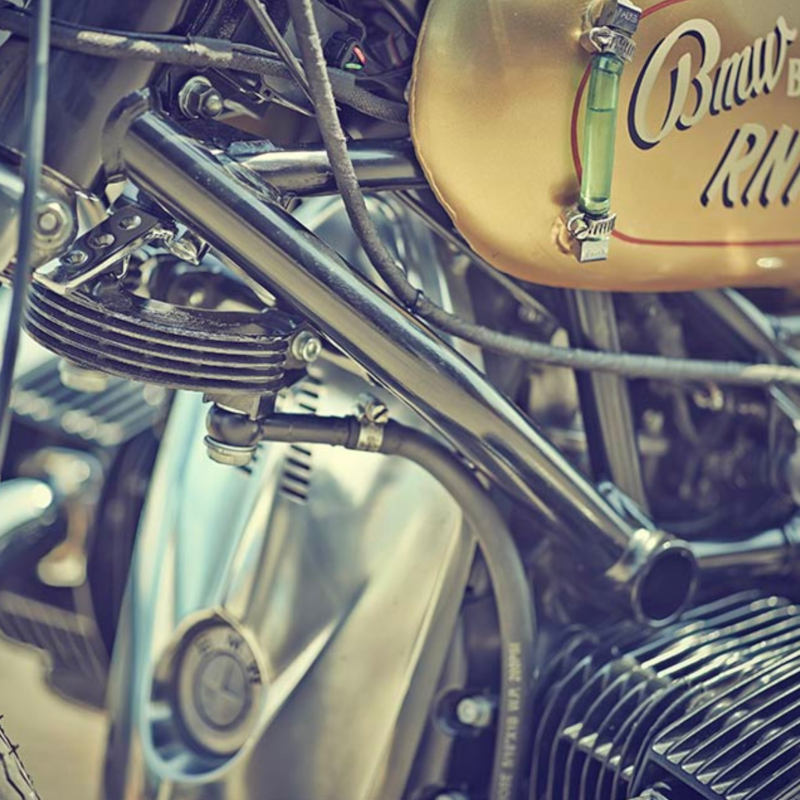 Méconnaissable ! Difficile de reconnaître une BMW R Nine T d’origine sur ce plan ; on croirait authentiquement un Flat Twin des années 70’ ! Et c’est là tout le talent de Brat Style, qui est n’a conservé de la moto donneuse que l’ensemble moteur / boîte / pont et la partie avant du cadre ! La boucle arrière sur-mesure a été soudée au cadre pour intégrer un dosseret de selle et une sellerie sur-mesure, et le réservoir a été fabriqué en aluminium spécialement pour elle, s’intégrant en une ligne droite parallèle au sol des plus rétro.