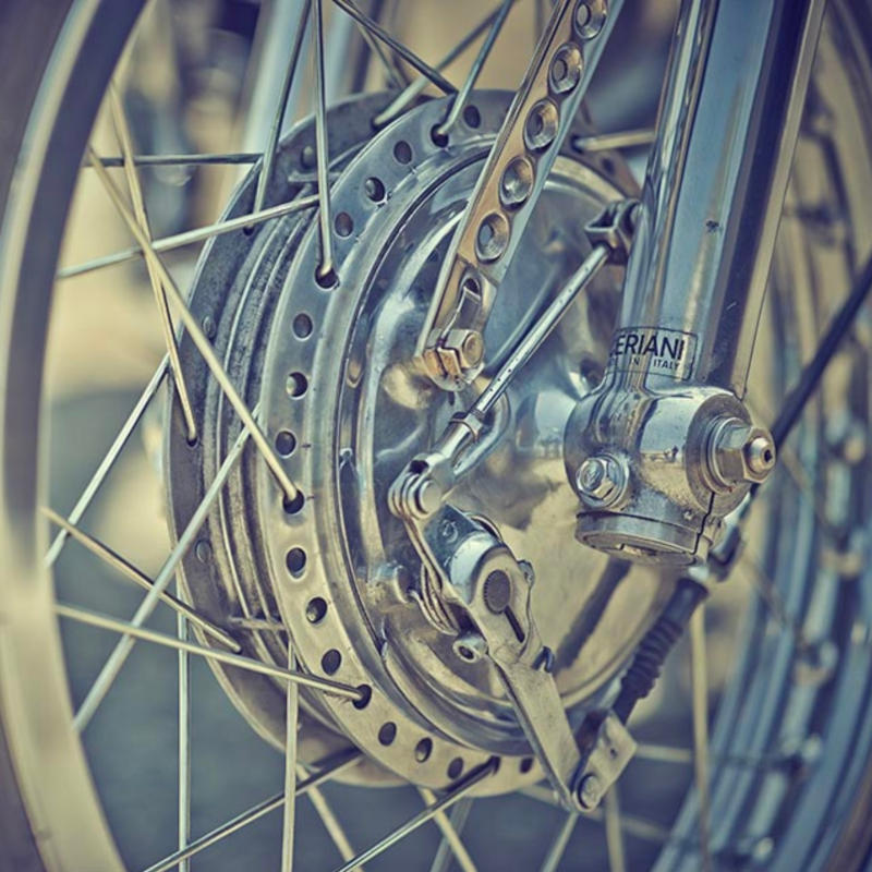 L’intégralité du train avant a été remplacé par des éléments ultra-rétro. La très moderne fourche inversée est ainsi mise au rebut, place à une fourche standard Ceriani, accompagnée de ses tés supérieurs et inférieurs en aluminium poli. La jante avant est munie d’un tambour à câble, rayonnée sur des cercles Akron H-type en 1.85x19. Plus vintage tu meurs ! À l’arrière, la tâche a été simplifiée, en conservant le moyeu d’origine et en le rayonnant sur une jante Akron en 2.15x18. L’ensemble est équipé de pneus vintage Allstate Tires/SAFETY TREAD en 3.50×19 à l’avant et 4.50×18 à l’arrière.